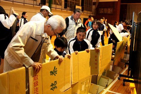 12日夜は、体育館で一晩を過ごすため、地域役員らと段ボール箱使ってパーテーション作りに挑戦。卓球台と完成した仕切りで、体育館を男女それぞれの空間に分け就寝し、被災者の苦労も体験しました。