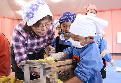 千浜幼稚園で1月11日、地元のボランティアグループ「ミーナの会(代表 藤原八重子さん)」協力のもと、園児が切り干し芋づくりに挑戦しました。