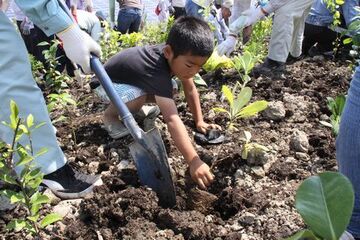 沖ノ須地内の防潮堤に、自治区、市民、企業、各種団体など約600人が参加。森林再生活動を行うNPO法人時ノ寿の森クラブの指導のもと、マサキやクロマツなど9種類3,000本の苗木を植えました。参加者は1,000平方メートルの防潮堤の斜面に、スコップで20センチほどの穴を掘った後、ポットに入った苗木をそっと置き、やわらかい土をのせ、手で押し固めながら、1本づつていねいに植えていきました。最後には、保水対策と雑草抑制のため、杉とひのきの皮をバケツリレーでかぶせました。